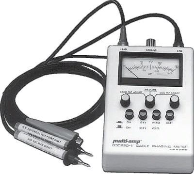 The Cable Phasing Meter is an instrument designed to measure voltage, determine phase potation and phase out cables when connected to the capacitive test points. This instrument is battery operated and is supplied with aground and two measuring leads.