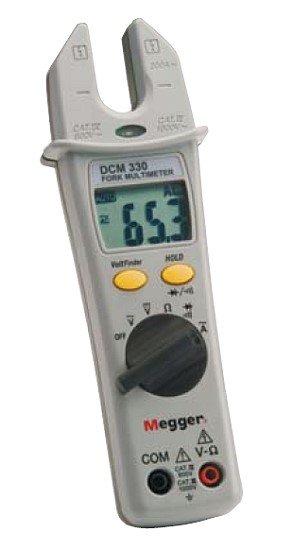 The Megger DCM330 Fork Multimeter is a convenient, compact instrument designed to measure AC current up to 200 A, and perform all the functions of a basic multimeter. With AC and DC voltage measurements up to 1000 V and resistance measurements up to 20 MΩ, a non-contact voltage detection facility and a continuity buzzer with diode-check, the Megger DCM330 is a truly versatile instrument. All of these features combined into a single compact instrument eliminates the need for separate multi-meter and clamp meter.