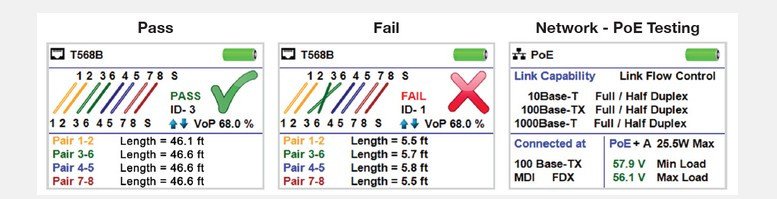 | Power over Ethernet | Tests for IEEE 802.3af and IEEE 802.3at (PoE Plus) compliant PoE Tests for classes and loads cable up to 25.5 watts (at class 4) Identifies Mode A or B (pairs with PoE) |